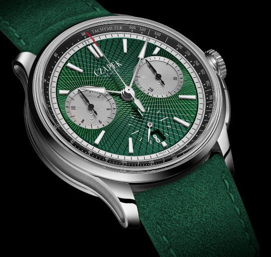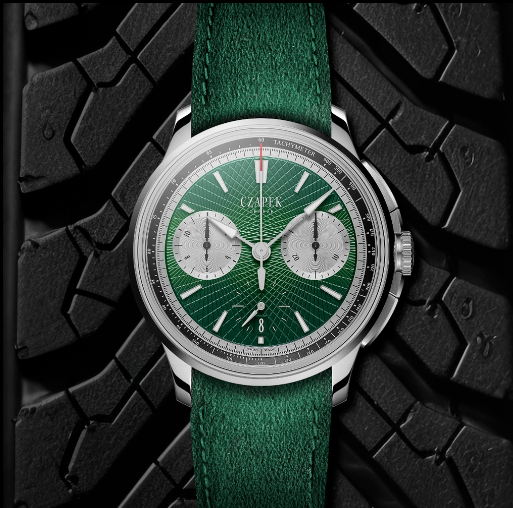 La prima impressione, quella che resta impressa a lungo, nasce dal quadrante di un verde intenso, un tono definito da Czapek come “English green”, un colore che cattura la luce e cambia sotto ogni angolo. Dietro questo colore c’è molto più di una semplice tinta: il quadrante è realizzato su una base in Alloy 401, una lega nobile che combina oro, platino, palladio e argento, e finito con un motivo guilloché “Crossroads”, una reinterpretazione moderna del più classico Double Soleil, più profonda e geometrica. Questo motivo richiama la scanalatura di un pneumatico da corsa, simbolo di movimento e precisione, sottolineando il carattere dinamico del cronografo senza perdere raffinatezza.