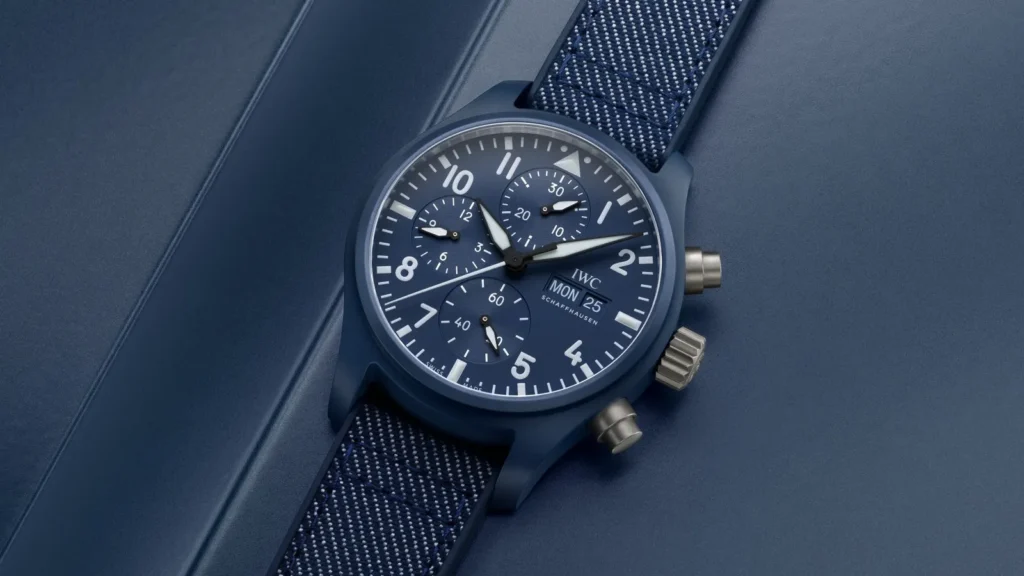 Il quadrante conserva l’estetica classica dei Pilot’s Watch. Numeri ben leggibili, contatori cronografici perfettamente equilibrati e quella sensazione di strumento professionale che da decenni accompagna la storia di questa linea. Non è difficile immaginare perché un giovane pilota di Formula 1 possa sentirsi a proprio agio con un orologio del genere. È preciso, tecnico e costruito per affrontare ambienti estremi.