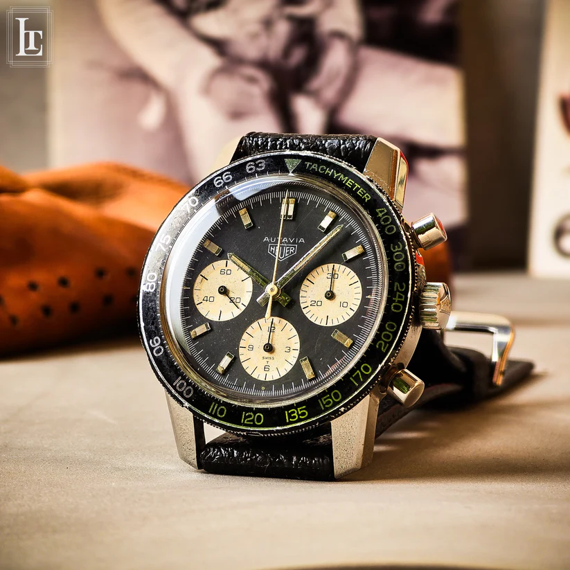 Nello stesso periodo, a Saint-Imier, Heuer lavora su un cronografo destinato ai piloti di rally e di endurance. L’Autavia 2446 nasce con uno scopo preciso: offrire massima leggibilità e robustezza in condizioni estreme. Il nome stesso, fusione di “AUTomobile” e “AVIAzione”, racconta la sua doppia anima. Con la sua lunetta girevole e i registri ben bilanciati sul quadrante nero, l’Autavia non è solo uno strumento per misurare il tempo: è una bussola per chi vive di velocità. Il suo calibro Valjoux 72, uno dei più raffinati cronografi manuali dell’epoca, garantisce precisione e affidabilità.