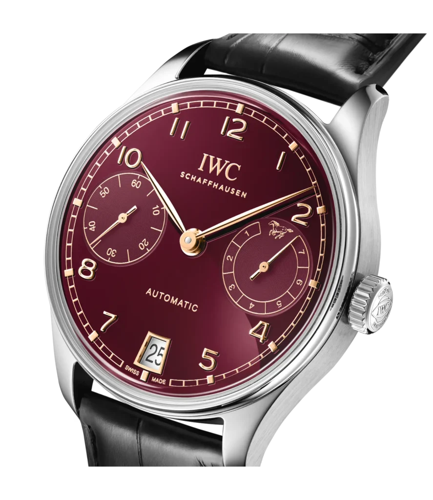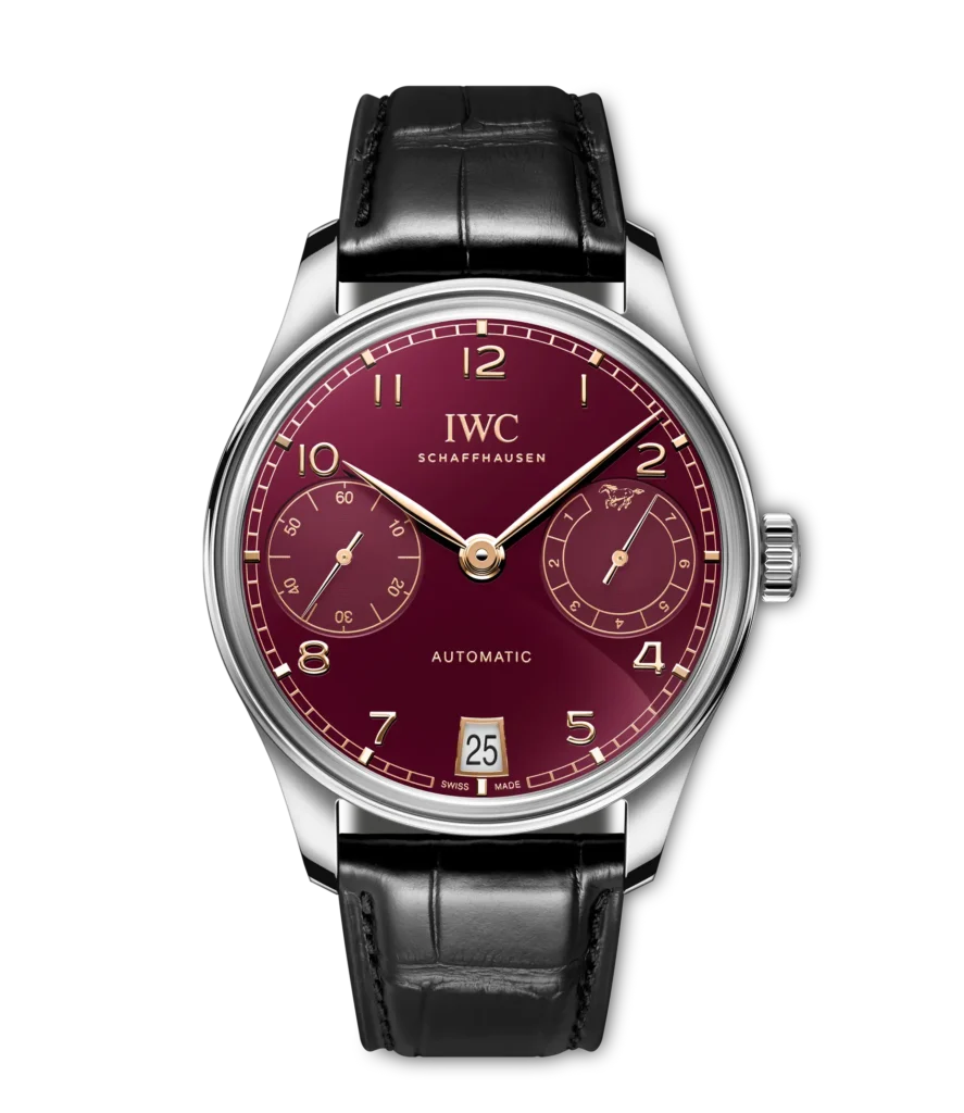 Il quadrante bordeaux, con lancette e indici dorati, non è una scelta casuale: richiama la “fortuna rossa” delle festività asiatiche e allo stesso tempo mantiene la sobrietà elegante della collezione Portugieser. Sul lato estetico funziona come ponte tra culture: Svizzera d’ingegneria, Oriente di significato. Il datario discreto alle 6, il piccolo secondo alle 9, la riserva di carica alle 3: la disposizione è quella classica della linea, ma in questa versione appare più consapevole, più ricca di senso.