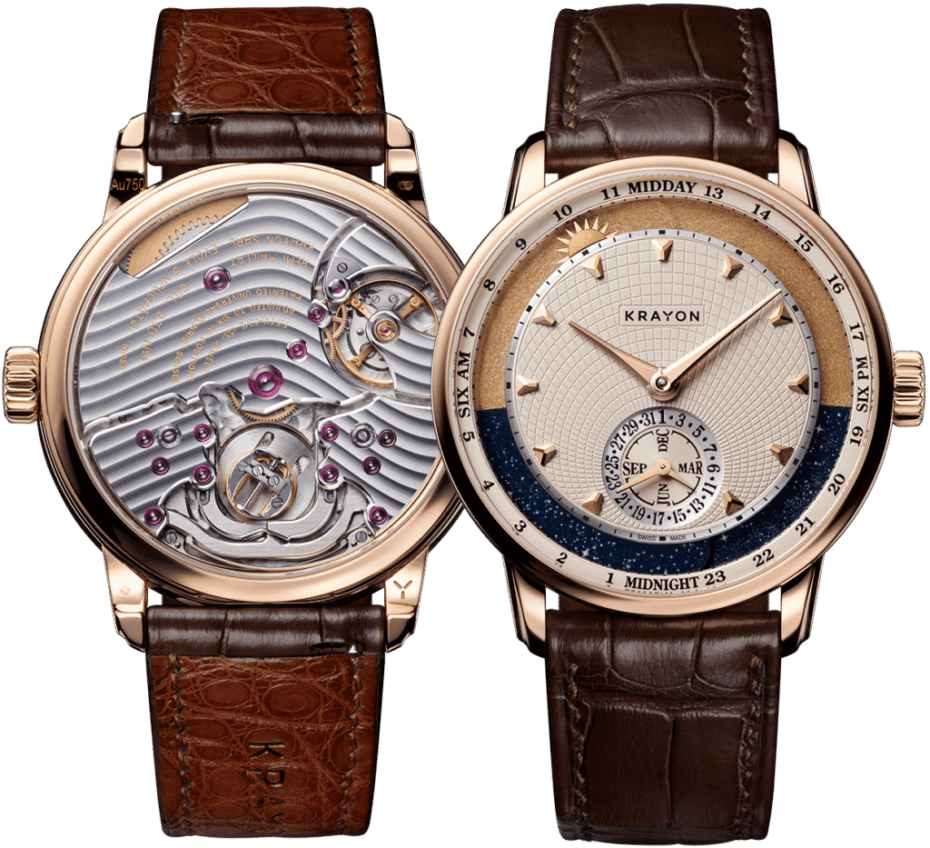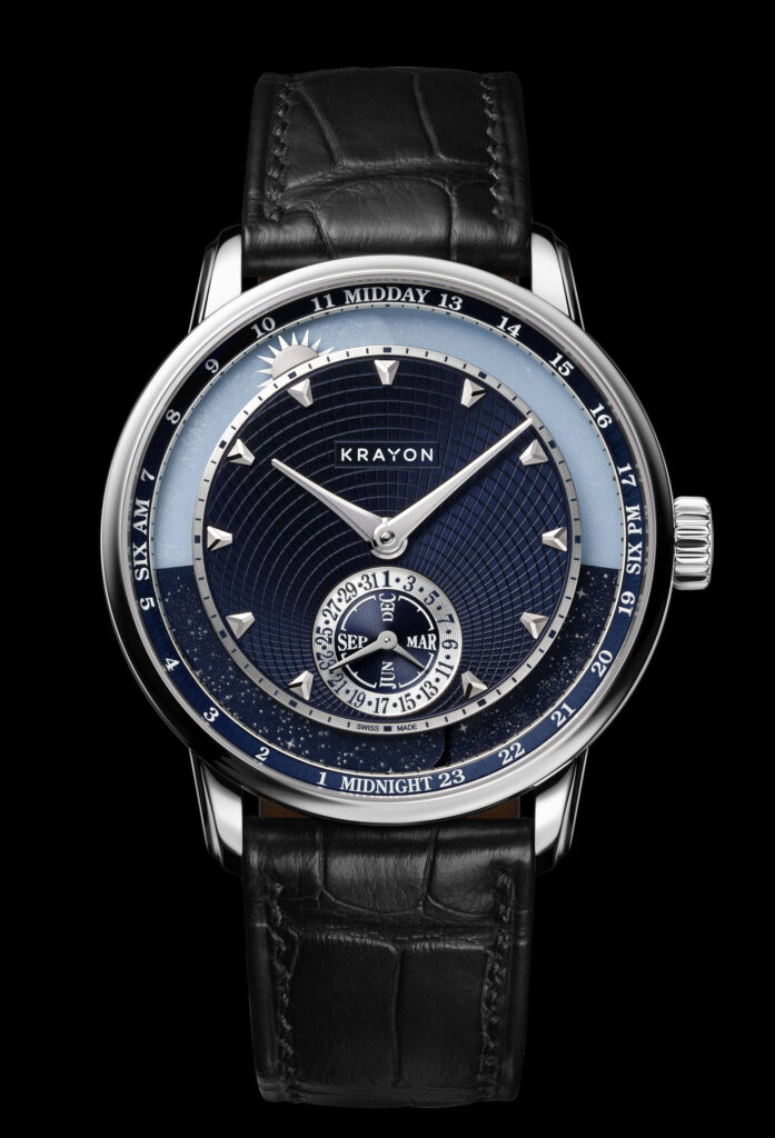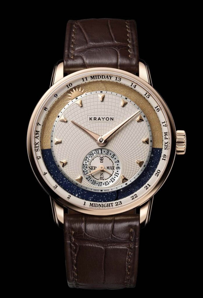 In un’epoca in cui molte complicazioni vengono progettate per stupire con numeri o grafici complessi, il Krayon Anywhere ricorda che l’orologeria può essere una poesia meccanica. Indica ciò che un fotografo cattura con una macchina fotografica: i momenti più significativi del giorno — alba e tramonto — ma lo fa attraverso un linguaggio strettamente personale, configurato sulla relazione specifica tra un individuo e il luogo in cui vive, lavora o sogna.