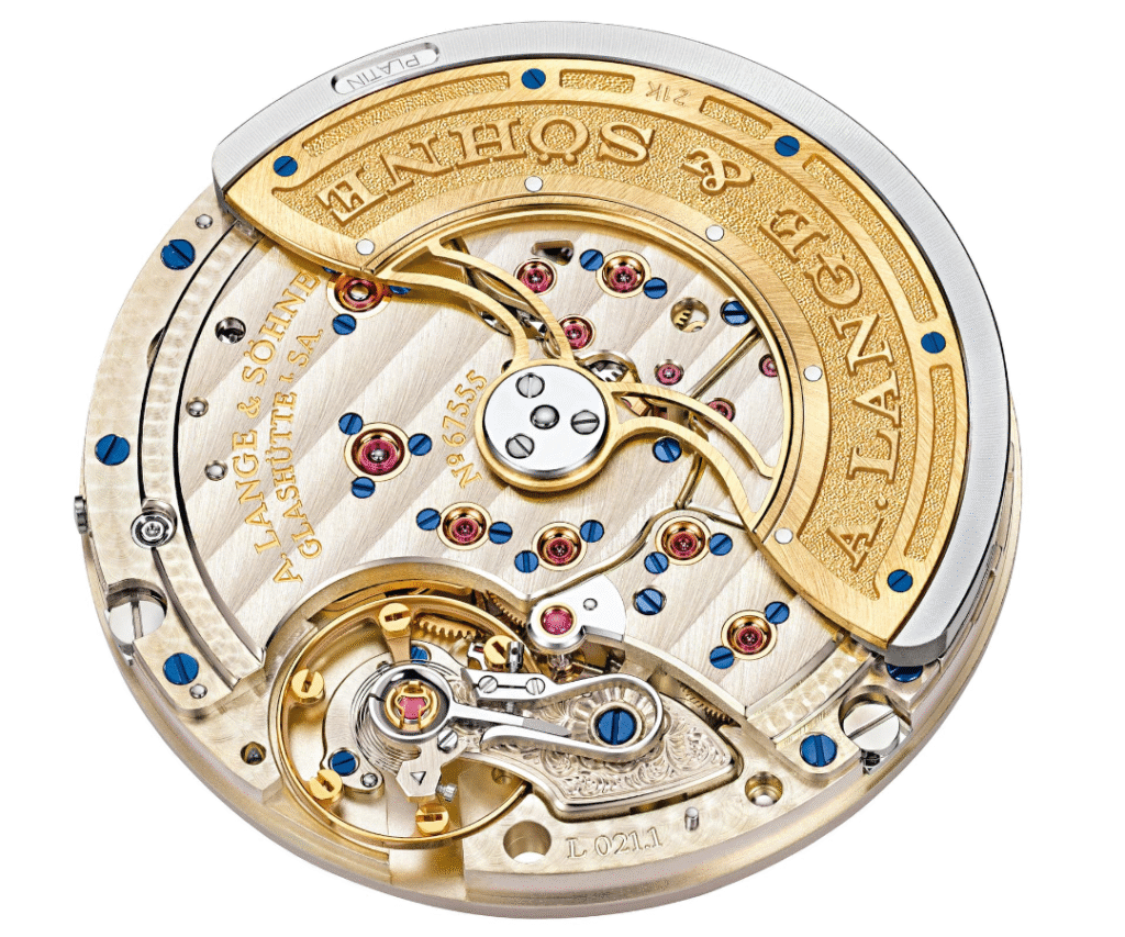 Girando l’orologio, il fondello in zaffiro apre una finestra su uno dei movimenti automatici più affascinanti mai prodotti da Glashütte. Il calibro L021.1 è una celebrazione del saper fare tedesco, con la platina a tre quarti in alpacca naturale, i castoni d’oro avvitati, i rubini incastonati a mano e il bilanciere rifinito con una cura quasi maniacale. Il rotore centrale in platino, parzialmente scheletrato, è inciso e integrato con una misura che rasenta l’arte. Tutto è funzionale, tutto è bello, nulla è superfluo.