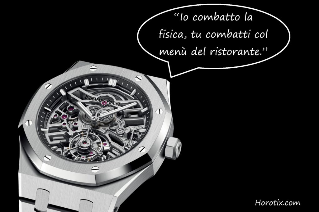 E quando la gabbia completa l’ennesima rotazione, il tourbillon lancia la sua ultima frecciata: “Avrei voluto nascere un semplice tre sfere: preciso, utile, onesto. Ma no, sono il ballerino di alta scuola dell’orologeria, obbligato a girare davanti a un pubblico che non capisce una virgola della mia coreografia. E sapete una cosa? Va benissimo così: almeno continuo a dare spettacolo.”
