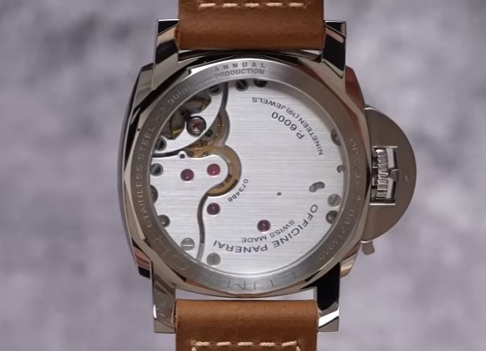 Dentro troviamo il calibro manuale P.6000, semplice, robusto, con tre giorni di riserva di carica.